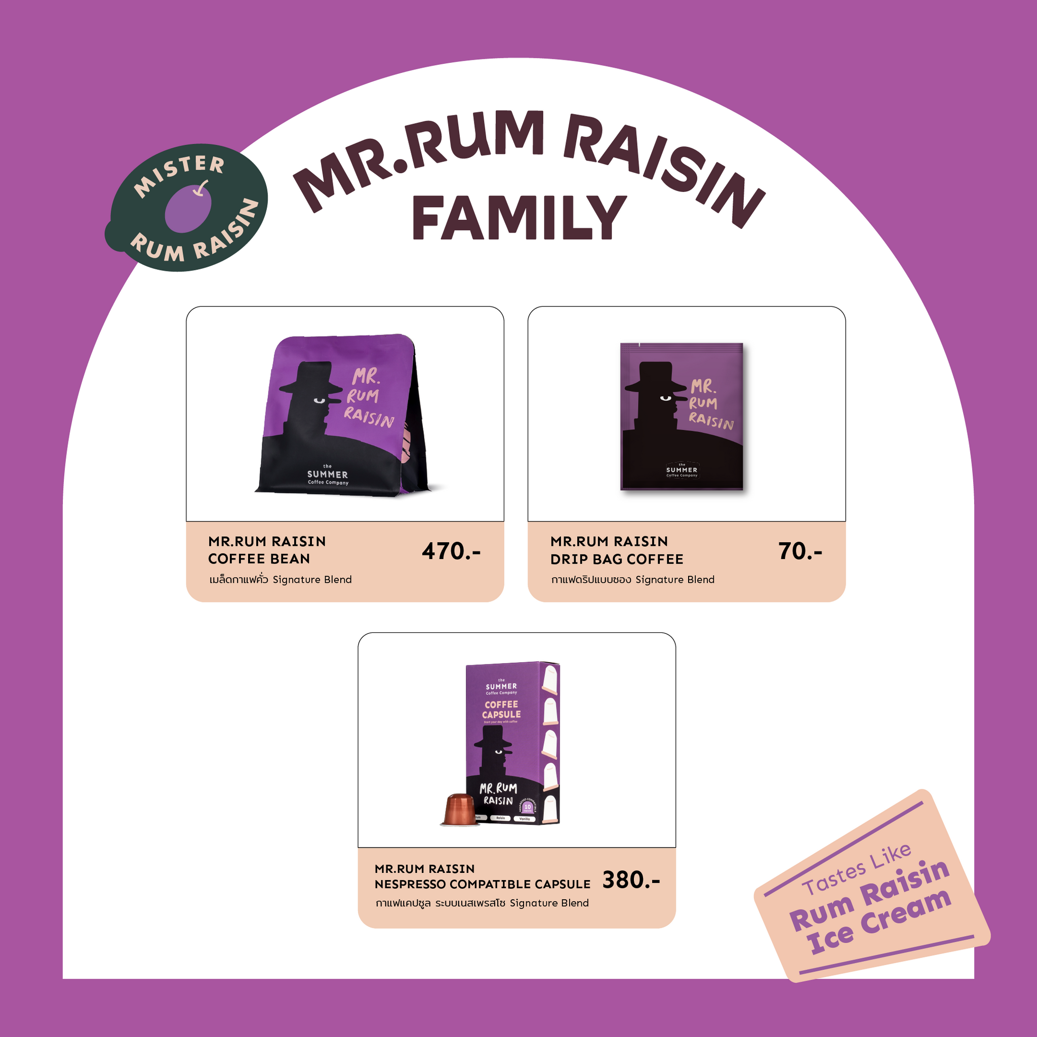 พาคุณออกจากกรอบกาแฟแบบเดิมๆ ด้วยกาแฟที่มีคาเรคเตอร์เป็นเอกลักษณ์เฉพาะตัว จากกระบวนการบ่มกาแฟที่ซับซ้อน ทุกครั้งที่ดื่มกาแฟ Mr.Rum Raisin จะได้ทั้งกลิ่น Rum และรสที่หอมหวานของ Raisin ทำเป็นกาแฟดำก็ว่าดีเเล้ว เเต่สูตรลับของเบลนด์นี้คือ เอาไปทำเป็นกาแฟนม จะยิ่งเหมือนทานไอศครีม Rum Raisin เลยค่ะ!